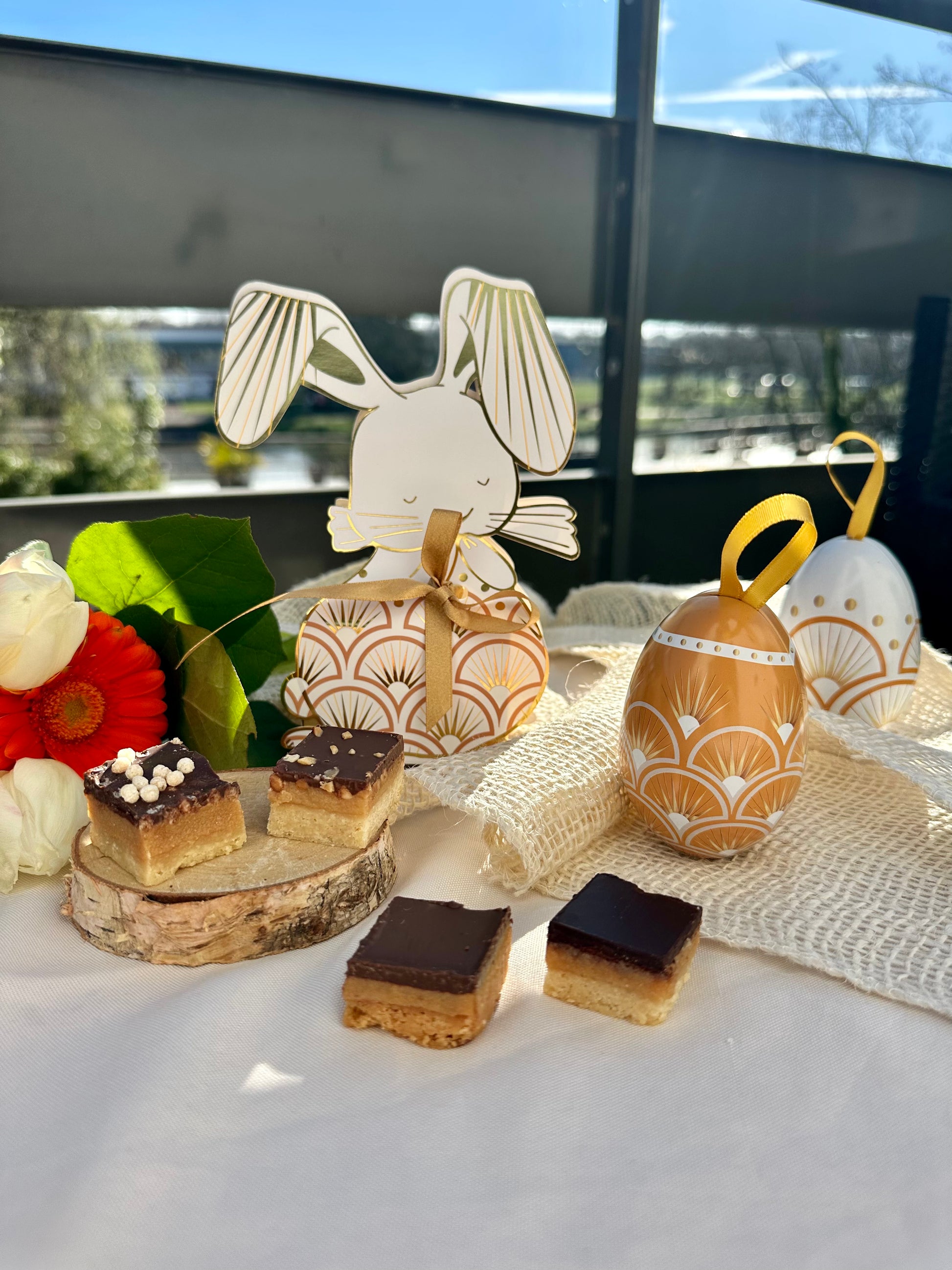 Chaque oeuf contient 1 shortbread Classique Lait + 1 shortbread Classique Noir.